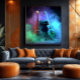 Two vibrant electric guitars - one in earthy tones, another in emerald blue - rest elegantly alongside an amplifier, creating an immersive musical atmosphere. The contrast between the instruments and the dark surroundings evokes passion and creativity, perfect for music lovers seeking visual inspiration.