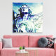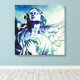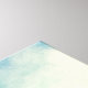 Um anjo prateado e azul em meio ao céu e às nuvens.