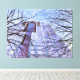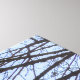 A imagem apresenta um edifício alto e moderno com uma fachada de vidro, vista de baixo ângulo. As janelas do prédio refletem o céu, criando uma matiz azul e roxa. Ramais de árvores negras moldam o prédio, adicionando um elemento natural à cena urbana. O céu é azul claro com algumas nuvens visíveis. O humor geral é sereno e contemplativo, destacando o contraste entre natureza e arquitetura.