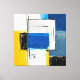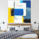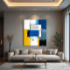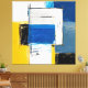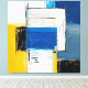 Um surto de cores vibrantes como amarelo, azul e branco, entrelaçadas com pinceladas pretas, forma uma composição abstrata que reflete caos e equilíbrio. Camadas de tinta sugerem profundidade emocional e movimento, convidando à interpretação pessoal.