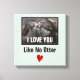 Uma tela impressa com uma fotografia fofa e romântica com duas lontras apaixonadas. Uma lontra está lambendo e beijando o pequeno rosto da outra lontra, os olhos fechados parecem agradáveis. O texto diz "Eu te amo como nenhuma lontra" com um coração de rabisco vermelho. Colocado sobre um fundo verde-claro.