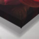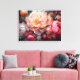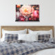 Uma vívida aproximação de peões e rosas florescentes, apresentando pétalas suaves e fluentes em tons de rosa, pêssego e branco contra um fundo escuro. Este belo trabalho de arte floral traz vida e elegância a qualquer quarto.