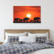 Uma família de elefantes continua com sua caminhada sem parar enquanto o sol se põe atrás deles. Suas silhuetas se destacam contra as magníficas cores do céu. Computação de Kathie Miller.