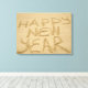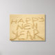 Este design apresenta uma imagem do texto "FELIZ ANO NOVO" escrito na areia com um pau.
