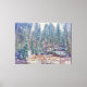 A imagem mostra uma floresta densa coberta por uma leve poeira de neve. Árvores altas e finas com folhagem verde chegam ao céu, seus troncos misturam matizes castanhos e avermelhados. O chão está parcialmente coberto de neve, com manchas de capim marrom e folhas caídas visíveis. A atmosfera geral é serena e pacífica, com uma paleta de cores legal e muda.