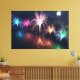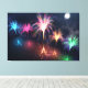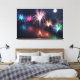 Cinco pulverizações de fogos de artifício refletidos na água escura por baixo - uma explosão de azul pálido, rosa rosa, ouro brilhante e verde de menta, e no centro brilha de todas as cores do arco-íris.