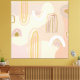 Arte moderna de abstrato para o escritório contemporâneo com arco-íris de tendências num pano de fundo de formas modernas em beges, pinks e café.