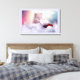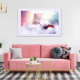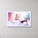 Arte de parede canvas com uma fotografia de um gatinho gengibre sentado sobre um chapéu branco e vermelho de Papai Noel. Luzes brilhantes turvas nos fundos.