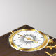 Fundo de madeira castanho com fundo marinho, cordilheira mecânica, volante antigo, âncora de ouro e diversas engrenagens de ouro e latão. Estilo Steampunk.