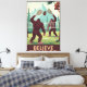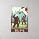 This funny Bigfoot “Believe” canvas print puts a surreal twist on classic 1930s WPA national park posters, reimagining the wilderness with a dose of playful cryptid chaos. Two Bigfoots face off in a forest clearing, locked in an enthusiastic game of badminton — using a pine cone as their shuttlecock — while an anthropomorphic squirrel stands proudly on a stump acting as the net judge. The bold shapes, warm tones, and vintage WPA layout give the scene an authentic retro feel, while the characters bring a humorous, unexpected energy to the design.