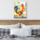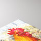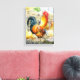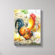 Um galo de galeria enquadrado por um bando de suas galinhas e feno em foco suave ao seu redor. Os amarelos e cinzentos gentis trazem o galo colorido para o centro da atenção, bem onde o pássaro orgulhoso gosta de estar. Este é um desenho mestiço em pasta de óleo e lápis colorido. Por Amanda Diehl, Designs Paxdomino