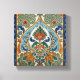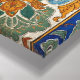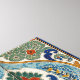 Floral pattern with symmetrical design, featuring stylized flowers and leaves in green, orange, and blue, with a border of dark blue and green.