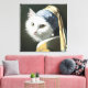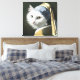 Um gato branco vestindo um véu azul e amarelo e um brinco de pérola, estilhaçado a se assemelhar a um retrato famoso de Johannes Vermeer