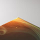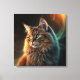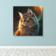 Trabalho de arte digital de um gato cabeludo marrom com olhos verdes brilhantes e brilhantes. O gato está posicionado no perfil 3/4, virado para a esquerda, com o pelo criado pela fumaça. O fundo é escuro, o que acentua o pelo brilhante do gato e os padrões fluentes e translúcidos que o cercam. A iluminação destaca os ouvidos do gato, com uma luz quente filtrando pelo pelo, criando uma atmosfera macia, quase mística. A composição é elegante e sonhadora, enfatizando a expressão serena do gato e a fluidez dos elementos ao redor.