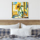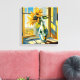 Um girassol brilhante sobre uma janela através da qual o sol brilha e o campo além podem ser vistos.