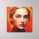 A girl with blue eyes on an orange background, dark black and crimson, photorealistic fantasies, personal iconography, detailed character design, shiny/glossy