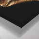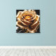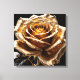 A single, meticulously crafted golden rose, gleaming against a black background. The details of the petals and leaves are sharply defined.