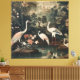 pintura botânica vintage de guindastes em pé num lago cercado por lindas flores exóticas com palácio ao fundo