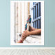 A moving and detailed photograph that captures the essence of faith and religious tradition. The image focuses on the hands of the faithful carefully and reverently holding a small statuette of Our Lady, positioned on the windowsill of a historic window with iron bars. The contrast between the texture of the ancient stone, the skin marked by time, and the vibrant colors of the saint's blue mantle creates a powerful visual narrative about spirituality, protection, and cultural heritage. Ideal for those seeking a piece that conveys peace, hope, and the strength of human connections through shared belief in moments of religious celebration.