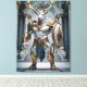 Imposanter Hirschkrieger mit mächtigem Geweih, goldener Rüstung und Schild in sakraler Architektur. Kraftvolles Motiv für Fans nordischer Sagen, Fantasy Welten und symbolstarker Tierkunst.