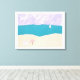 Esta tela é desenhada com a minha representação de uma praia com um guarda-chuva e uma cadeira sob um céu lavanda.