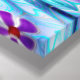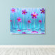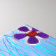 Um desenho digital de lindas flores roxas estilizadas com centros vermelhos brilhantes. Estão a espreitar-vos com instabilidade a partir da erva alta ao lado de uma piscina de água ripada.
