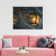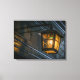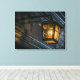 Uma fotografia de perto de uma linda lanterna preta iluminada à noite impressa em uma canvas.