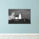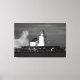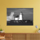 Tela preta e branca nítida, com um farol vintage com onda nebulosa. Adição atrativa ao decor náutico.