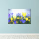 Tulipas amarelas e azuis se destacam em um campo numa legal manhã primavera. À luz do sol, eles se destacam como copos de luz ouro.