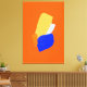Esta pintura de abstrato apresenta uma superposição de planos em amarelo, azul, branco e laranja, dispostos adjacentemente sobre o fundo vermelho em negrito.