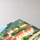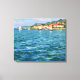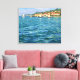 A representation on canvas in the impressionist pictorial style of the sea inland with boats in the distance.