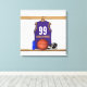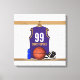 Uma camisa de basquete roxa e dourada pendurada num cacifo com uma bola de basquete, tênis de basquete e uma garrafa de bebidas. A camisa é personalizável com seus próprios números e nome, para criar um presente único para o jogador de basquete ou fã de basquete