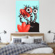 Arte de canvas de monstro bonito com uma criatura de desenho animado preto com quatro olhos em longos caules riscados brancos e pretos sorrindo, escondidos em tulipas abstrato vermelho.