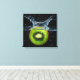 Uma fatia de kiwi vibrante faz um salto dramático enquanto atinge a água, criando gotículas dinâmicas contra um fundo escuro