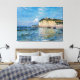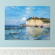 "Low Tide at Pourville, perto de Dieppe" captura uma cena costeira serena na costa da Normandia, na França. Esta pintura faz parte de uma série criada enquanto fica na pequena vila de Pourville. A composição exibe uma praia na maré baixa, com areia exposta e rochas que levam o olho do espectador em direção ao mar tranquilo e penhascos distantes. O uso da cor é sutil, mas eficaz, com blues suaves e verdes dominando a paleta, refletindo a atmosfera legal e calma do litoral. O céu está pintado com matizes delicados, sugerindo um dia pacífico e ensopado. A escova é solta e impressionista, enfatizando as texturas da areia e da água. A pintura captura lindamente os efeitos transitórios da luz e da atmosfera. O reflexo da luz sobre a areia molhada e as ondas suaves acrescentam à cena um senso de movimento e profundidade. "Low Tide at Pourville, perto de Dieppe" é um testemunho da habilidade de representar o mundo natural, mostrando uma habilidade de transmitir a beleza silenciosa de uma simples paisagem costeira. Ela reflete um fascínio pelo mar e seu domínio em capturar os moentes em mudança da natureza.