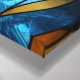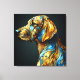 Um retrato capturando a cabeça de um cão numa na moda contra um pano de fundo escuro. Este trabalho de arte de vidro manchado com abstrato apresenta uma paleta de tons azuis, turquesa, amarelo, laranja e ouro. A textura artística e as cores criam uma representação vibrante e elegante do nosso amado amigo de quatro patas.