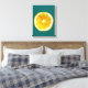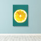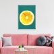 Uma fatia vibrante bonita e colorida de uma pintura original do artista Sacha Grossel. Esta grande fruta de pop nos citros é amarela e muito brilhante e colorida contra um fundo comum de cor azul. Quirky e original.
