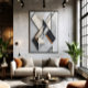 Abstract art combining noble marbles in white, black, and gray tones with bronze details. Diagonal geometric shapes create depth and movement. Perfect for modern decor seeking sophistication, minimalism, and a high-end architectural aesthetic with timeless elegance.