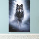 A powerful canvas print featuring a majestic grey wolf emerging from dense fog, standing tall with a calm, intense gaze. Soft mist, cool tones, and cinematic lighting create an atmosphere of introspection, strength, and silent leadership. Perfect wall art for a living room, office, or premium gift.