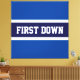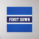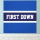 Este design de futebol esportivo apresenta texto atlético FIRST DOWN dentro de uma grande faixa azul marinho traçada em branco contra faixas externas azuis reais.