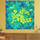 Impressão de tela com pintura floral colorida baseada em um esboço salva-vidas. Linda flor marisca, enorme folha de burdock e botões de dandelion. Paleta de cores: ouro e amarelo-limão, turquesa, cor verde e azul. acrílico no papel, 2022 © Julia Khoroshikh www.juliakhoroshikh.art #floralart #botanicalart #botanicalpainting #floralpainting #marshmarigold #caltha #wallart #printoncanvas #walldecor
