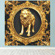 Uma imagem impressionante que apresenta um lobo negro contra um quadro decorativo de ouro luxuoso, evocando um senso de mística e poder. O contraste entre o pelo elegante e dourado do lobo e os detalhes intrincados e elegantes da moldura cria uma composição visualmente cativante.