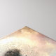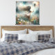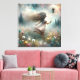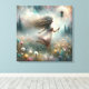 Uma jovem de cabelo fluido é representada correndo por um campo segurando uma cabeça grande de semente de dandelion no estilo Monet trabalho de arte