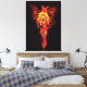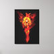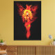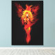 Mulher que é uma chama com asas. Uma fênix em uma chama vermelha, laranja e amarela num pano de fundo de preto.