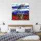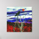 Num céu noturno com algumas nuvens está uma lua de cheio que é vermelha e ascensão sobre um conjunto de montanhas e colinas. Um corvo é empoleirado em um galho de uma árvore-passarinho-morto olhando para a floresta de árvores de folhas vermelhas. Trabalho de arte Copyright ©2018 Kimberly J Tilley.