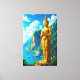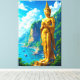 Libere o espírito da Tailândia com esta trabalho de arte impressionante. Uma estátua majestosa de ouro fica alta em um penhasco, observando uma costa pacífica pontilhada com barcos e enquadrada por exuberantes montanhas tropicais. Esta imagem mistura perfeitamente a espiritualidade serena com a beleza impressionante da natureza. É uma peça poderosa e calmante que irá adicionar um toque de elegância mundana a qualquer espaço.