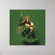 A powerful ocean warrior bursts into action in this dynamic comic-style illustration. Featuring a muscular hero with flowing golden hair, a striking green battle suit, and a glowing trident weapon, the artwork captures motion and intensity. Bold green energy streaks and dark splatter textures create a dramatic underwater battle atmosphere. Perfect for fans of heroic fantasy, ocean legends, and high-energy comic book aesthetics.