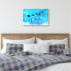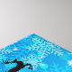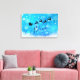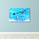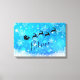 Canvas de arte de Natal com uma silhueta preta de Papais noeis cavalgando em seu trenó sendo puxado por sua rena voando pelo céu. Acredite que está escrito em uma fonte de script de tendência. O fundo é um design de floco de neve gelado azul gelado.