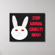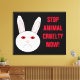 Esta tela mostra a face triste de um coelho branco. Este coelho tem uma grande testa na face porque é um coelho de laboratório que fez testes de cosméticos nele. Os brancos de seus olhos são vermelhos e inchados. O design foi criado para chamar a atenção para o sofrimento desnecessário causado pelos testes de cosméticos em animais. O texto vermelho em negrito diz "Pare a crueldade dos animais agora!"