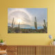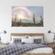A imagem captura uma paisagem desértica com cactos de alto teor de saguaro sob um céu com um halo solar. O sol brilha bruscamente, parcialmente obscurecido por um dos cactos, criando um efeito de explosão de estrelas. O halo forma um arco-íris circular à volta do sol. O primeiro plano é cheio de vegetação do deserto, incluindo cactos e arbustos. À distância, as montanhas são visíveis sob um céu nublado.